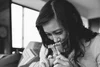 Mother holding newborn and reaching for a chip from a newborn family documentary photography session in atlanta