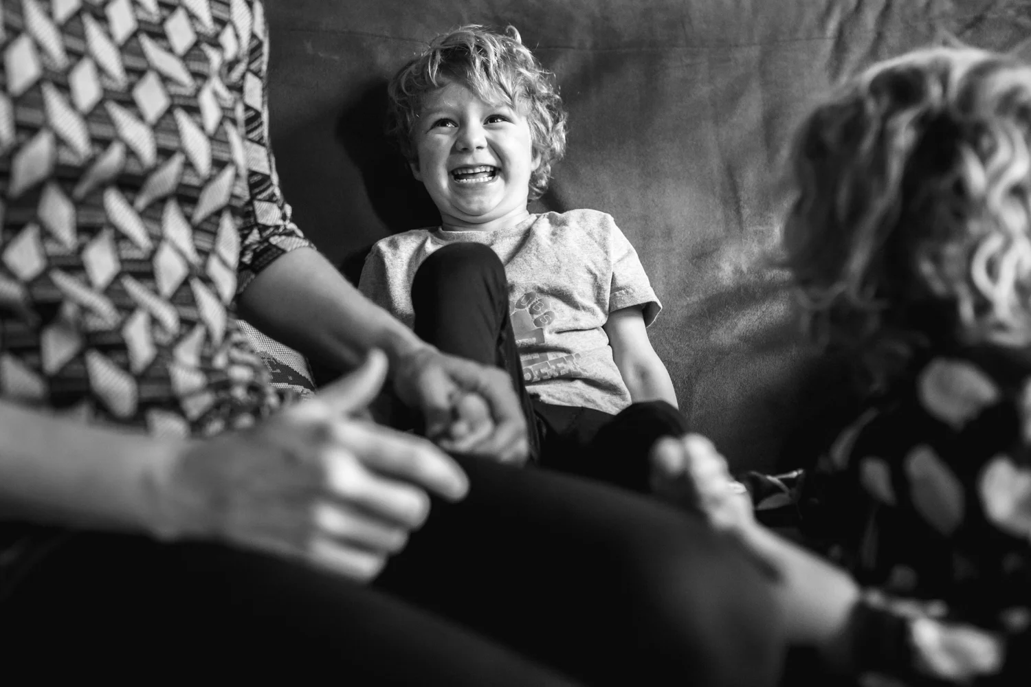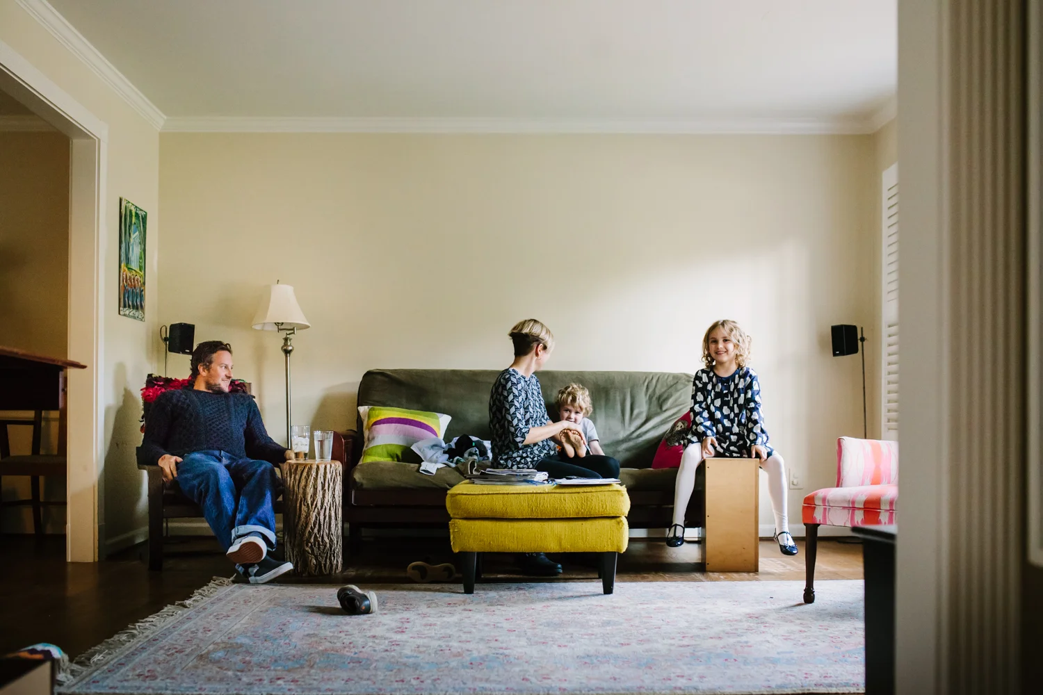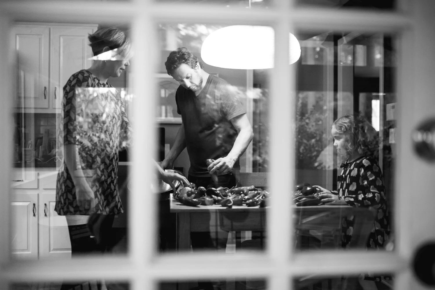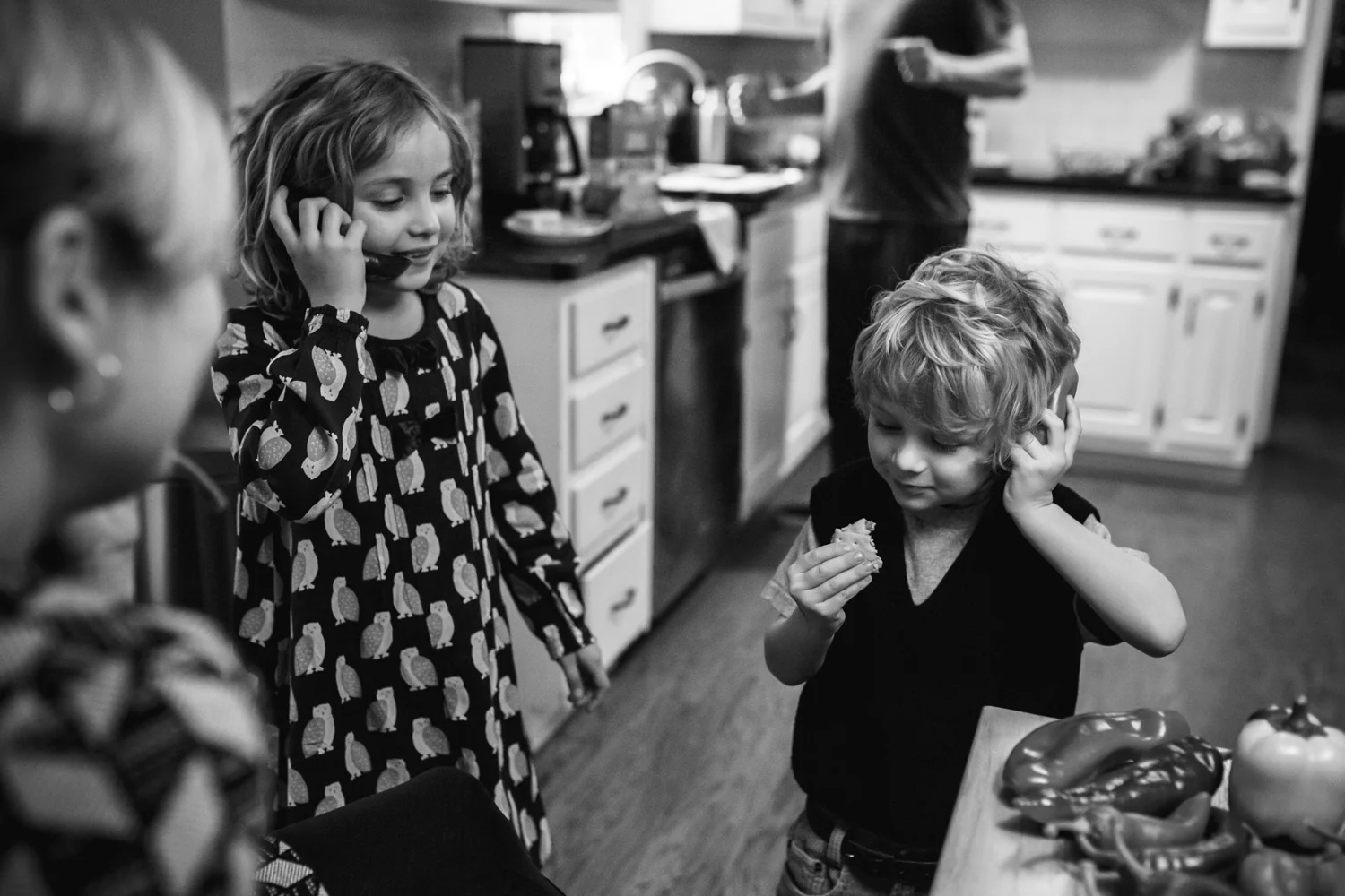 I arrived just in time to wake up Fin from his nap. While Fin was waking up and stretching out, Vivian was excited to introduce me to their new kitties they named Gigi (for Glitter and Glamorous) and John. I bet you can guess who got to name them. Carrie was kind to want to put up the cats knowing that I am allergic to them, but I wouldn't have it. One of the best parts about documenting a family in their home is being able to include pets in the family's story. This year, I was missing Roy, their dog who was in their pictures last year but didn't make it to this year's pictures. Gigi and John have clearly brought a lot of joy and playfulness to the family in Roy's absence. And this session was not short on joy and playfulness. From tickling feet on the couch to window jumps, to goofy giggles, we had a whole lot of fun. We spent some time picking some (a ton) of peppers from their garden (be jealous, I got to take home a bag of those peppers) and wandering around in their backyard. After bringing them in to wash them, they were temporarily used as play phones before they were eaten like apples. It's always a pleasure spending time with the Wsols.